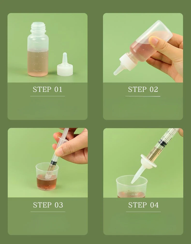 4. Needle cylinder matching: includes four types of needle cylinders with capacities of 1ml, 3ml, 5ml, and 10ml, providing multiple scale options, and the bottle body scale is clearly visible. All four types of needles are suitable for any type of pacifier and can be replaced as needed.