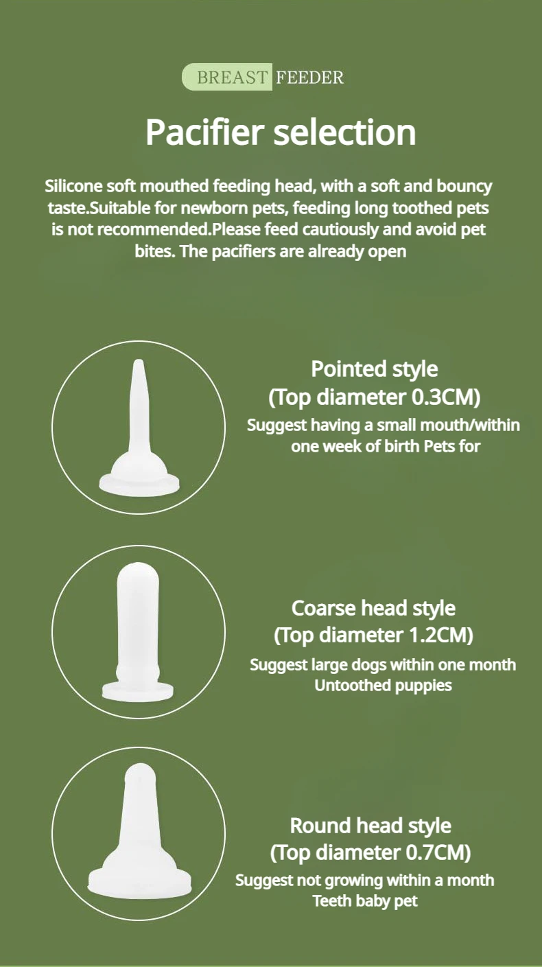 3. The pacifier is made of soft silicone material and is suitable for newborn pets. Please do not use it for long toothed pets as it may damage the pacifier and pose a risk of accidental ingestion. Please feed carefully to avoid pet bites.