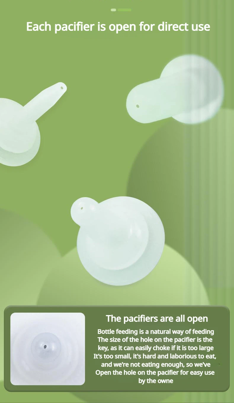 3. Multiple pacifiers to choose from: Available in various shapes such as pointed, thick, and round nipples. The pacifier has been pre opened and can be used directly.