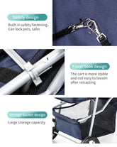 Wheels: rotate 360 degreesRear wheel: BrakeBuilt-in seat: removable cleaning padBuilt-in seat belt: SupportRear: With small pouchMaterial: Oxford material, iron frameColor: pink, dark blue, black....Net weight of cart: 5kglimited weight:30KG